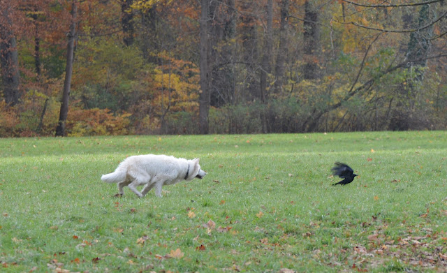 Aber was sehen meine Hundeaugen, eine hübsche einladende Krähe, die gerade, was für ein Schicksal, in eine andere Richtung guckt, ist es fast eine regelrechte Einladung ihr hinterher zu rennen...