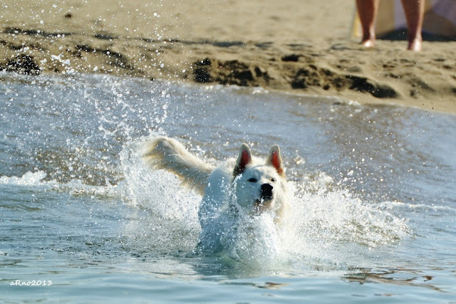Oggi, a differenza di quando siamo stati qua a maggio, dove la spiaggia era praticamente a mia disposizione soltanto, giá la mattina alle otto era già piena di persone e cani di tutte le taglie...